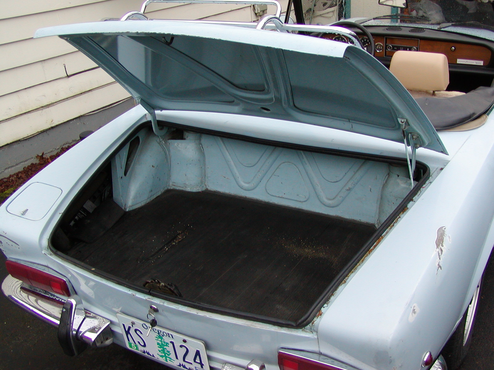 16-December-2002Detail photos of the car after we towed it up from Medford. Saturday morning my stepdad and I pulled the engine and transmission out of the Fiat. We thought it would be easier to pull the entire package out at once. If we would have known to remove the shift tower guts, disconnect the idler arm support bracket (to make room for the transmission to slide forward) and take off the little hood latch, it would have been cake. It still wasn't very hard, but we spent some time fiddling about. Then, my friend and co-worker Tyler arrived with his giant Mopar Cummins Turbo Diesel, and we loaded the Fiat on a tow dolly. We made the trip north just fine, although it was horrible weather. Tyler's dog, Tucker, a giant German Wirehair, shed all over the front of the Fiat. So, don't mind a few loose hairs in the photos below. Oh yeah, I snapped a few pics of our fun removing the old engine, but I'm having trouble getting them off the little memory card. I'll keep trying.