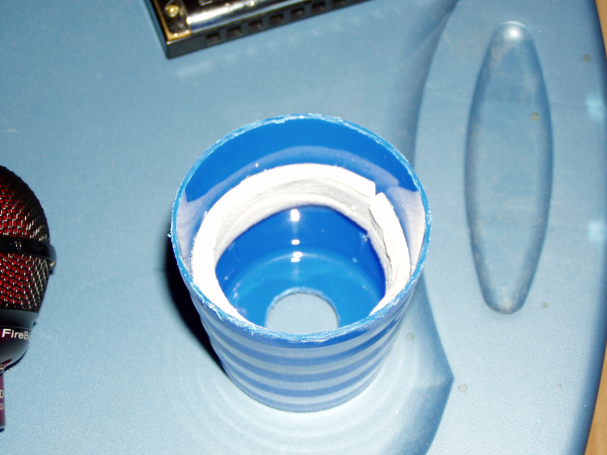 My dad bought me an Audix Fireball microphone for playing amplified harmonica. These are nice mics, with a really hot element. My only problem with it is that it's hard to get a decent seal with my hands around it. Inspired by people I've seen using cups and/or drinking glasses for special effects and for practicing holding something about the shape of a traditional harp mic, I decided I'd build a "mic in a cup" to try to get a better seal. It worked great, and was very simple to do: