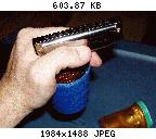 Now you've got a mic you can actually get a seal on. I'm definitely able to get a better overdrive of the mic's element now. Here are a couple short quickly-whipped-together sound clips to illustrate the difference between accoustic playing, the mic-in-a-cup fireball, and my homemade pill-bottle mic -- the latter two played through my Fender Blues Junior amp. All of these were recorded through my laptop's built-in mic with Audacity software on the same settings, so the level you hear reflects the difference in the mics. I was just sorta noodling on the harp, but I tried to keep the noodling to be at least a bit similar for recording each of the sources.